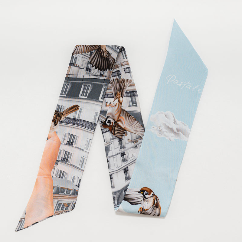 Entrez dans l’univers parisien avec cette lavallière en twill de soie, ornée en toile de fond des toits et des façades haussmanniennes qui se dessinent dans un ciel lumineux.
